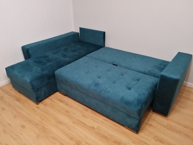 Pod siedziskiem znajdziesz pojemny schowek na komplet pościeli, koce i poduszki.